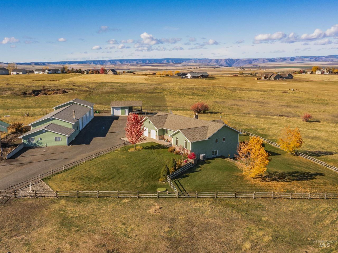 This 11.74-acre fully fenced horse-friendly property is well planned, with buildings positioned to enjoy the expansive views of the Camas Prairie. Offering 3,392 sq. ft. of living space, all living amenities are on the main level with an attached 28 x 36 oversized garage, plus the downstairs offers a large bonus room/hobby space, a living room with a wood stove, bathroom, utility, and bedroom. Perhaps the highlight of the property is the impressive 34x120 shop that includes an office/ADU, bathroom, utility room, paint room and dust collection system perfect for a contractor or woodworking enthusiast. Attached to the shop is a 28x38 RV Bay with 20x14 overhead door. Overall there is 5144 sq ft of shop space to work, play and protect your toys. Animal owners will value the 20 x 24 enclosed barn with power and water, along with 14x20 and 16x24 covered areas ideal for your animals shelter. A seasonal creek flows through the property, adding charm and utility for livestock. The driveway is large enough to turn around a semi-trailer and offers ample parking. The yard is fully fenced, with an automatic sprinkler system, three maple trees, and one quaking aspen, and offers plenty of room for a garden. Conveniently located in the heart of North Central Idaho, access to world-class fishing, hunting, and outdoor recreation is out your front door. 30 GPM well. No HOA or CCRs.